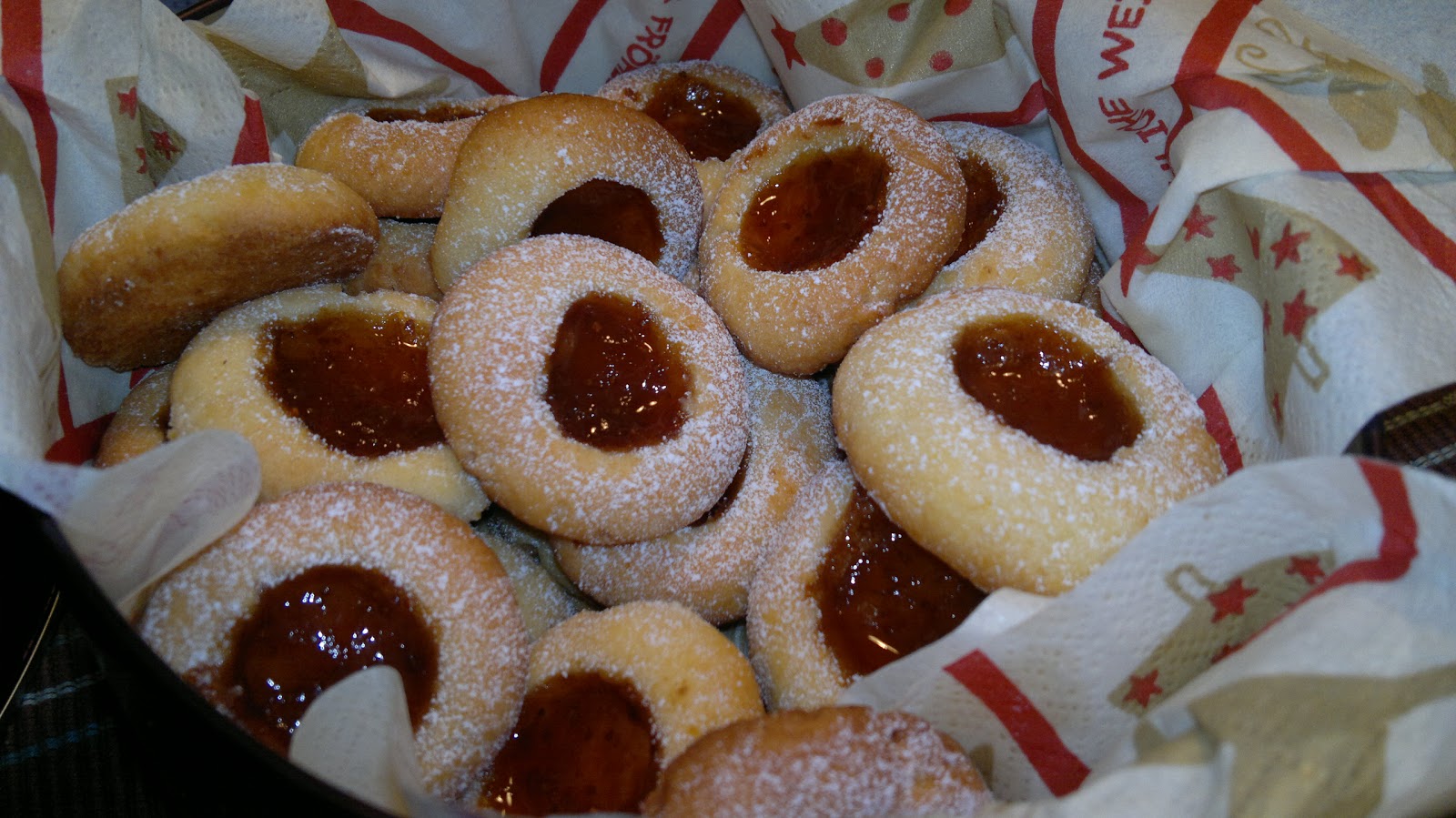 Die Zutaten zu einem glatten Teig verarbeiten und 2 Stunden kaltstellen. Aus dem Teig kleine Kugeln formen und auf ein mit Backpapier belegtes Blech setzen. Mit einem in Mehl getauchten Kochlöffelstiel Löcher in die Kugeln bohren. Ich mache die Löcher immer was größer, damit mehr Marmelade reinpasst, aber das ist Geschmacksache. Mit einem Teelöffel die Marmelade in die Löchlein füllen und im vorgeheizten Bachofen bei 180°C Umluft 10-15 Minuten backen.